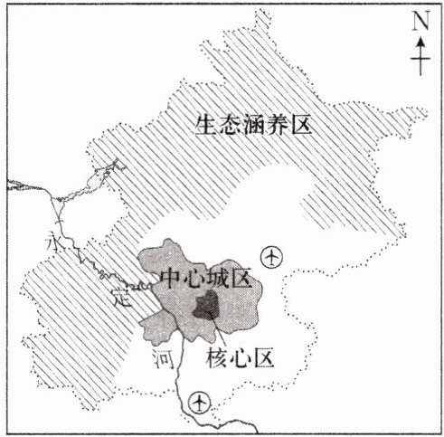 探究资料 《北京城市总体规划(2016年—2035年)》提出了“一核一主一副、两轴多点一区”的城市空间结构,提出了北京的战略定位是4个“中心”,即政治中心、文化中心、国际交往中心、科技创新中心。北京城市副中心建设是为了调整北京空间格局、治理大城市病、拓展发展新空间的需要而提出的,也是为了推动京津冀协同发展、探索人口经济密集地区优化开发模式的需要而提出的。下图为北京城市规划简图。