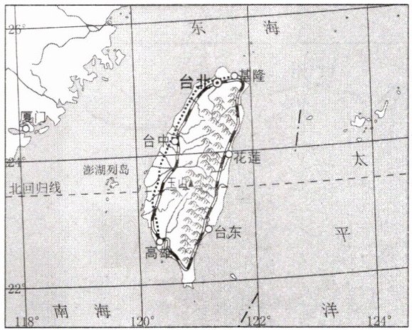 实践资料 “乡愁是一湾浅浅的海峡,我在这头,大陆在那头”这一句诗抒发了台湾同胞对大陆浓浓的思念。台湾是祖国神圣不可分割的领土,尽早实现台湾与祖国大陆的统一,是海峡两岸人民的共同愿望。下图示意台湾的位置。