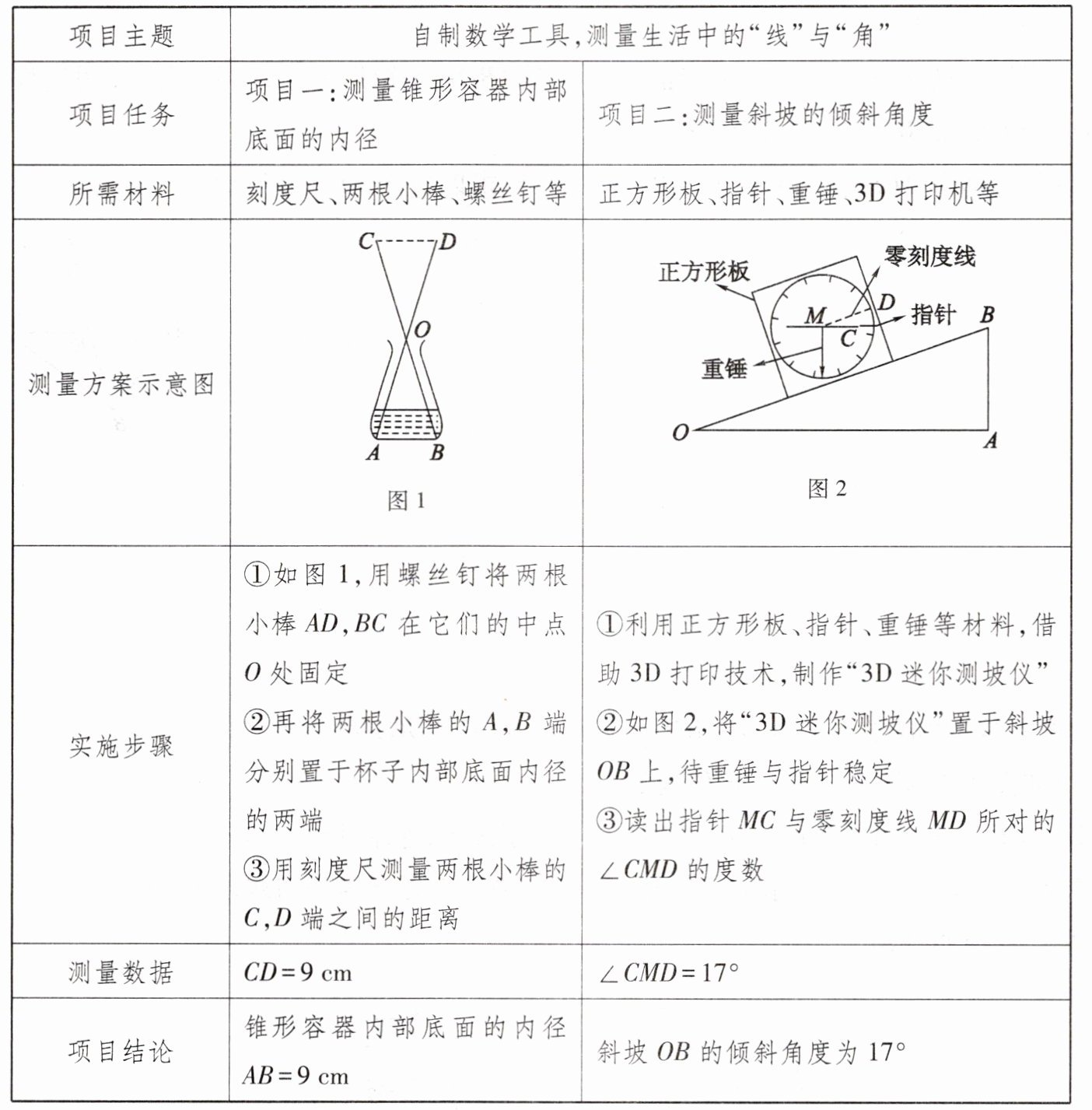(1)项目一中,利用了全等三角形的性质. 通过证明△AOB≌△DOC,就可以得到AB= CD= 9cm. 判定△AOB≌△DOC的方法是(