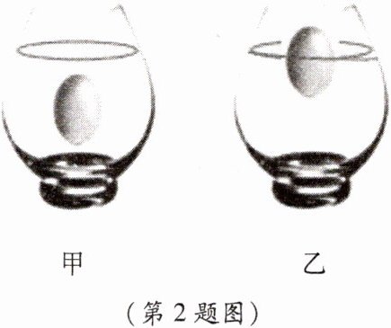 2. 如图所示,甲、乙两个相同的杯子盛有不同浓度的盐水,放在同一水平桌面上,将两个质量、体积均相同的鸡蛋放入两个杯子中,当鸡蛋静止时,两个杯子中液面恰好相平。下列说法正确的是 (