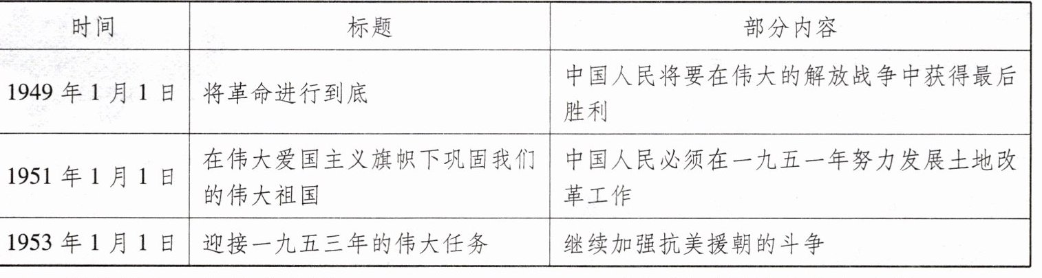 4. 下表是1949—1953年《人民日报》元旦社论的标题和部分内容,据此可以看出当时党和人民的中心工作是(
