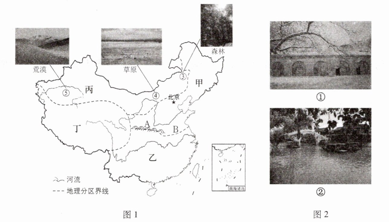 在中国辽阔的大地上,由于各地的地理位置、自然条件存在差异,人文、经济方面也各有特点,因此全国可分为北方地区、南方地区、西北地区、青藏地区四大部分。下面图1为中国四大地理区域图(图中甲、乙、丙、丁分别代表四大地理区域),图2为中国传统民居素描图。