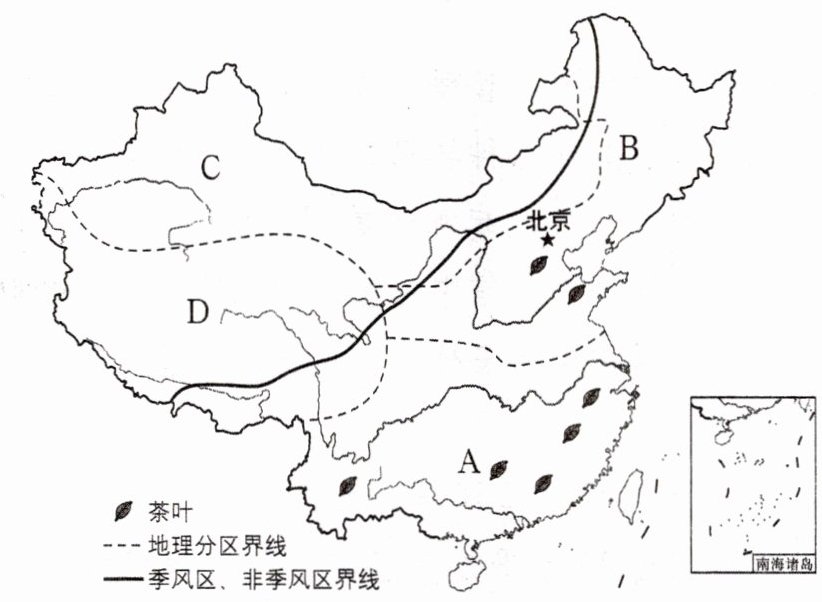 D 区域为青藏地区,该地区以高原为主,海拔高、气温低、热量不足、气候高寒、降水量少,且青藏高原草甸土广布,土壤贫瘠,自然条件难以满足茶叶的生长;青藏高原地区茶叶种植和加工技术落后,人口稀疏,劳动力不足,当地社会经济条件难以支撑茶叶的种植,当地不适合种植茶叶。如果在青藏高原进行茶叶种植的话,需要通过科学技术来实现,比如通过大棚保温技术、改良和培育耐低温品种等,使茶叶适应当地自然环境。