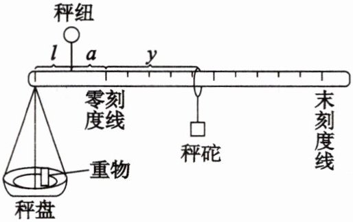【知识背景】如图,称重物时,移动秤砣可使杆秤平衡,根据杠杆原理推导,得$(m_{0}+m)\cdot l= M\cdot(a+y)$,其中秤盘质量$m_{0}g$,重物质量$mg$,秤砣质量$Mg$,秤纽与秤盘间的水平距离为$lcm$,秤纽与零刻度线间的水平距离为$acm$,秤砣与零刻度线间的水平距离为$ycm$.