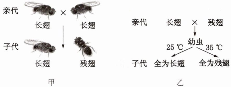 翅果蝇,则这只果蝇的基因组成为Aa;否则,该果绳的基因组成为AA。(4)据图乙可知,果蝇的幼虫在不同温度下可发育成不同性状,说明生物的性状表现是基因与