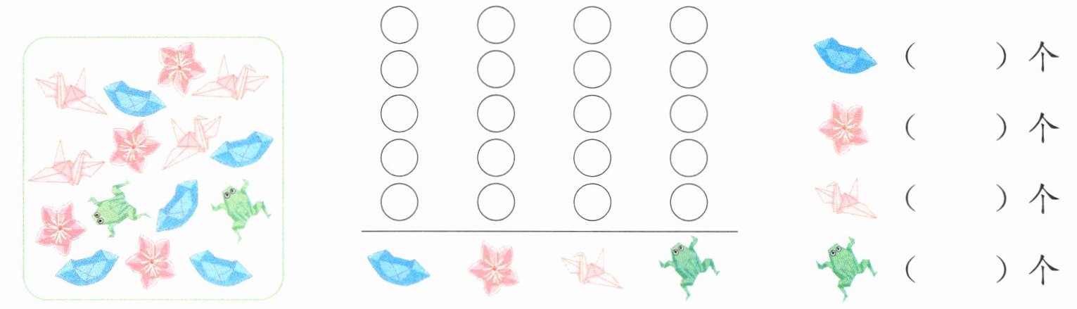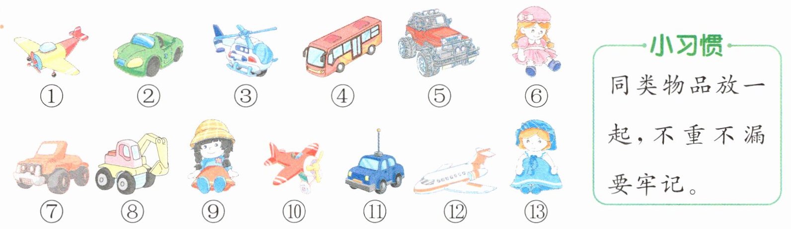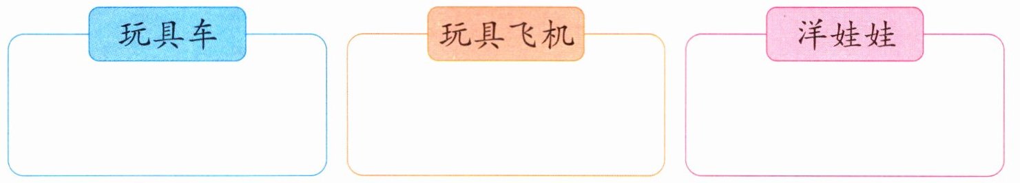 (2)玩具车的辆数是6,玩具飞机의架数是4,洋娃娃의个数는3,6>4>3,玩具车最多,洋娃娃最少。