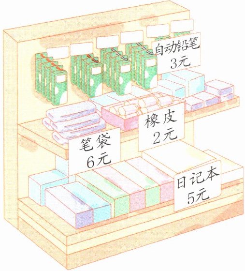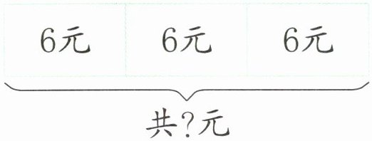 解析:本题考查利用乘法解决实际问题。每个笔袋的价格是6元,买3个笔袋的总价格是:$3 × 6 = 18(元)$。答案:18元。