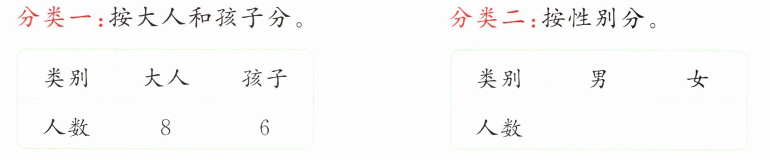 @@解析:题目考查的是自选标准分类计数的能力,需要理解题意,确定分类标准,并表示分类结果。同时,通过对比不同分类标准下的分组结果,理解分类标准对结果的影响。答案:分类二的结果可以填为:|类别|男|女||人数|7|7|通过对比,我们发现虽然分类标准不同,但每种分类标准下分的结果数据加起来的总数是一样的,都是14人。