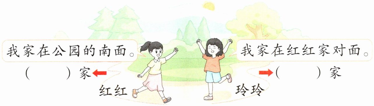 3. 红红和玲玲在公园玩,太阳快要落山了,请你根据对话,找一找她们的家。