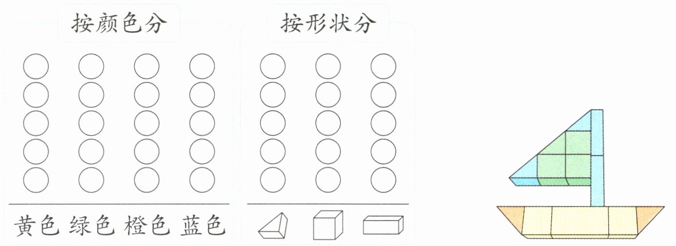 2. 乐乐用积木搭了一条小船,请你把这些积木分一分,再涂一涂、填一填、圈一圈。