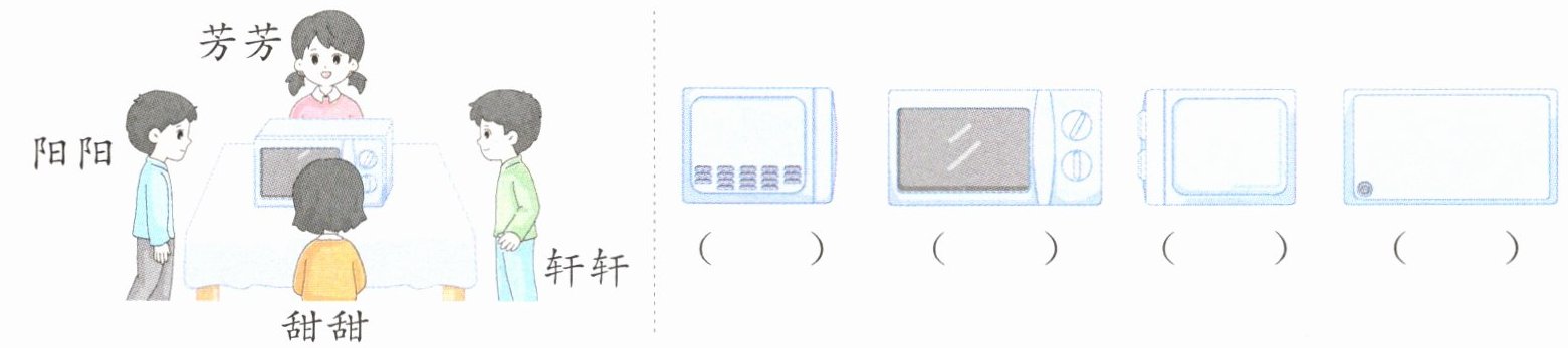 2. 下面右边的四幅图分别是谁看到的? 在括号里填上对应的人名。