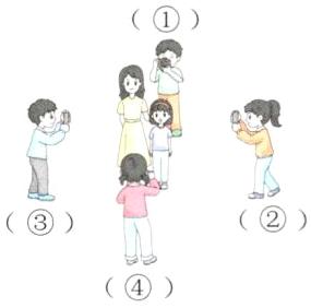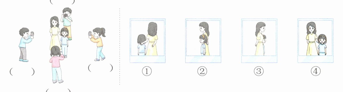 4. 下面右边的四张照片分别是哪个小朋友拍到的? 根据照片,把序号填在对应的括号里。