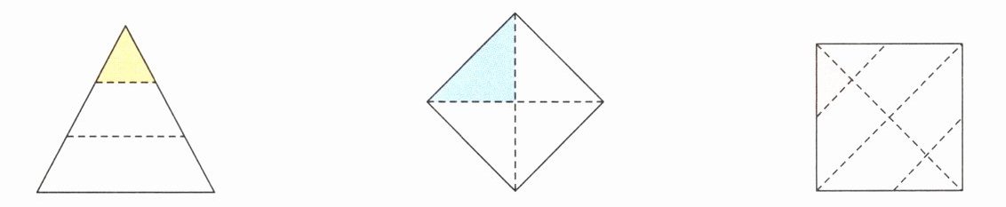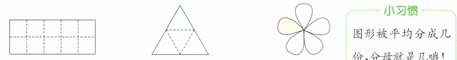 2. 下面各图中的涂色部分是整个图形的几分之一?请用分数表示出来。