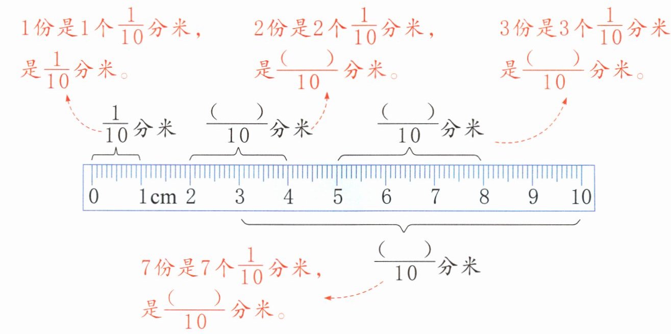 把1分米平均分成10份,每份是1厘米,是1分米的$\frac{1}{10}$,也就是$\frac{1}{10}$分米;取几份就是十分之几分米。