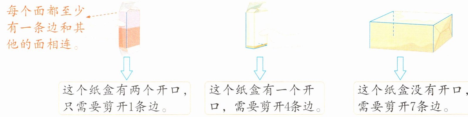 1. 有两个开口的纸盒需要剪开1条边;有一个开口的纸盒需要剪开4条边;没有开口的纸盒需要剪开7条边。
