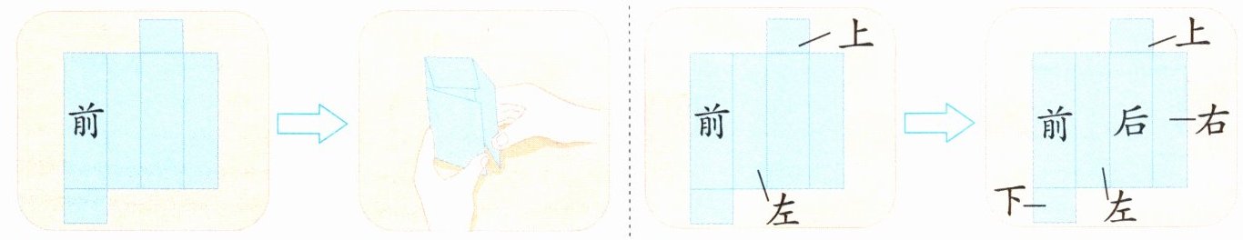 3.要在剪开后的图形上找到原来纸盒上的6个面,可以先确定从前面看到的那个面,再围起来看一看。同理可以得到纸盒的后面、左、右面和上、下面。