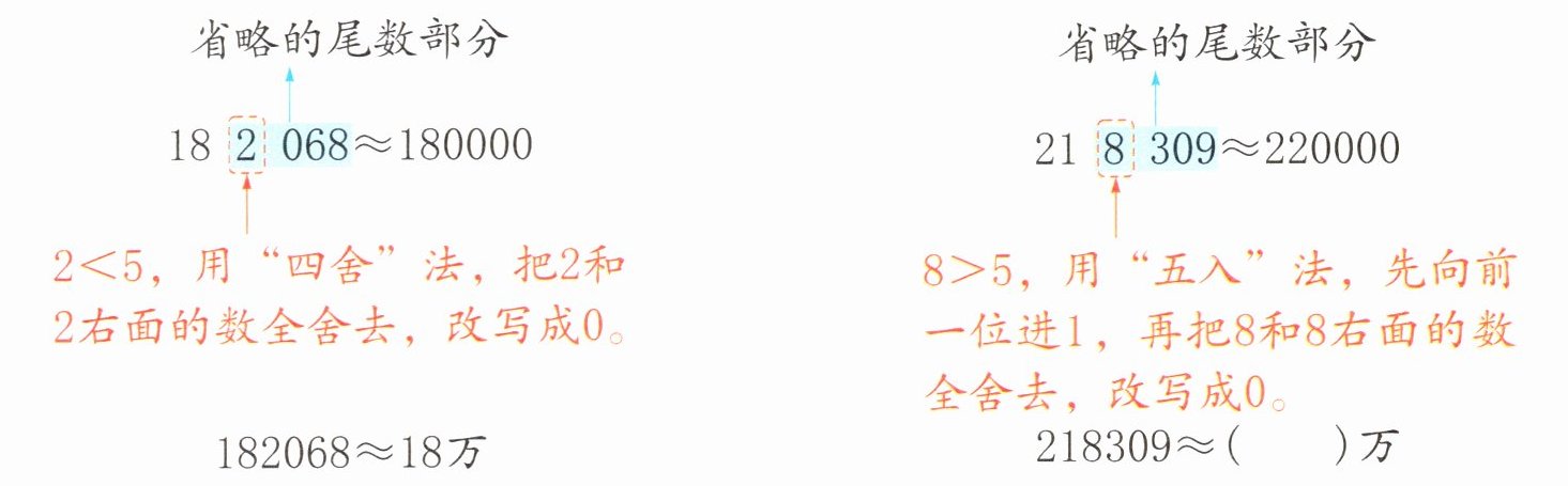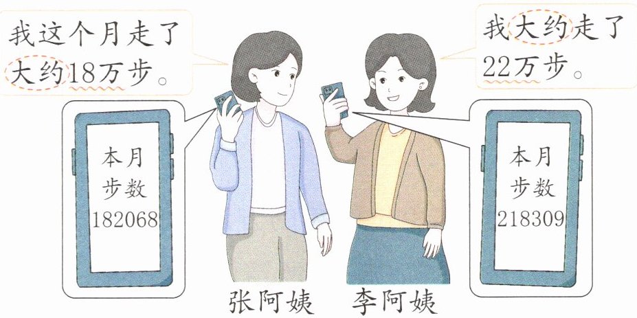 张阿姨说的18万步是将182068用“四舍”法求出近似数,再改写成用“万”作单位的数得出的。李阿姨说的22万步是将218309用“五入”法求出近似数,再改写成用“万”作单位的数得出的。