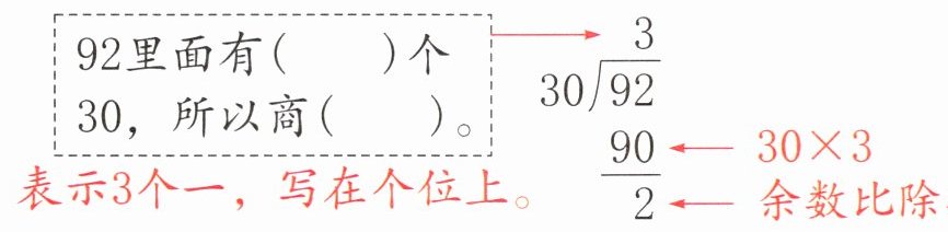 1. 求可以分给几个班,就是求92里面有几个30,列式为(