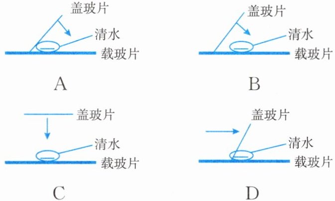 3. 制作洋葱鳞片叶内表皮细胞临时装片时,盖盖玻片的操作方法如图所示(图中撕下的洋葱鳞片叶内表皮已经展平在清水中,箭头表示盖上盖玻片的方向,椭圆表示载玻片中央的清水),其中正确的是 (