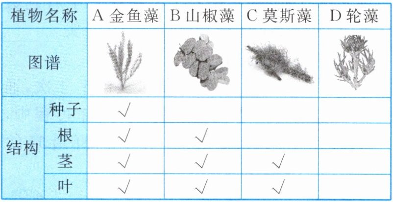 8. 鱼缸造景是指使用水生生物、石头及沉木等所打造的工艺品,观赏性强。金鱼藻、山椒藻、莫斯藻、轮藻等都是常用的水生造景生物。请根据如表所示这四种植物的分类图鉴,回答下列相关问题。