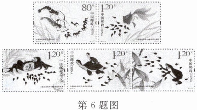 6. “我们的妈妈呢?我们的妈妈在哪里?”你是否还记得故事《小蝌蚪找妈妈》里这句经典的问话。如图所示为根据该故事情节发行的一套水墨邮票,请据图回答下列问题。