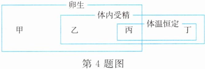 4. 霍加狓——长颈鹿唯一尚未灭绝的近亲动物,该物种通常每胎只生一幼兽,哺乳期约为6个月。它与如图所示的甲、乙、丙、丁四种生物在分类上属于同一类别的是 (