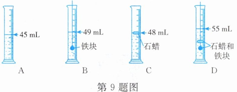 (选填“大于”“小于”或“等于”)45 mL。(2)石蜡不能沉入水中,为了测量石蜡的体积,某同学采用如图所示的方法,石蜡的体积是