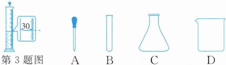 3. 小周想用量筒量取30 mL的溶液,如图虚线所指的位置为量筒中目前已量取的溶液体积。则应选用图中哪种器材继续取用液体最能避免体积超出30 mL (