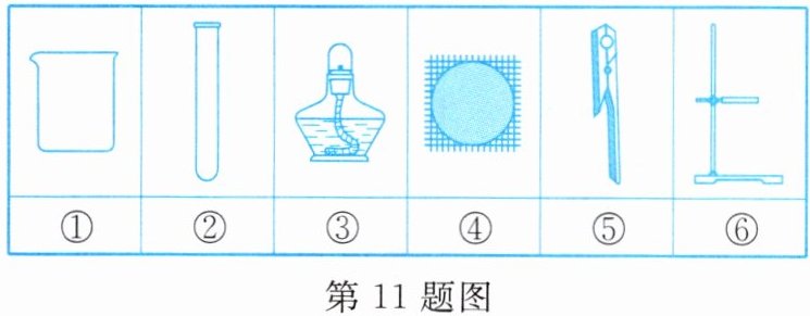 11.D 【解析】加热约3mL液体,属于加热较少体积的液体,应用试管,加热试管中的液体不需要用石棉网,需用酒精灯、试管夹。