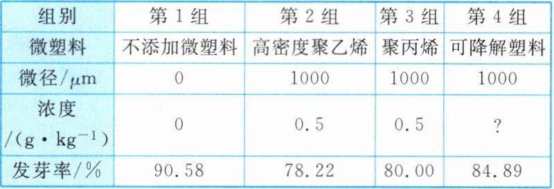 7. 微塑料是一种新型的环境污染物,为了探究不同类型的微塑料对小麦种子萌发的影响。某科研小组将大小相同的小麦种子分为 4 组,每组 100 粒,再选取 3 种微塑料在自然环境条件下开展盆栽实验,统计分析在 3 种微塑料影响下小麦种子的发芽率(实验结果如表所示)。
