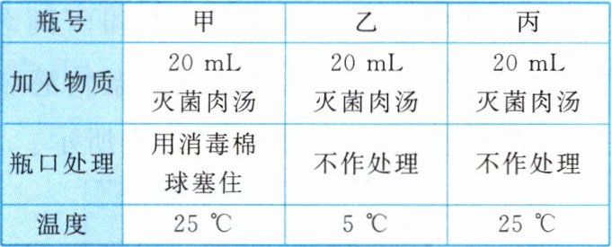 4. 为了探究食物腐败的原因和细菌生存的条件,学校项目化小组同学用经高温蒸汽灭菌的三个相同锥形瓶,分别标记为甲、乙、丙,按如表所示内容进行实验。请分析表中包含了几组对