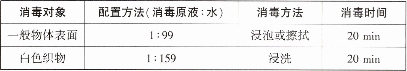 13. (2024 山东济南 SDFZ 分班考)84消毒液是家里常用的消毒液,如表为84消毒液(原液有效氯含量5%)的使用比例表: