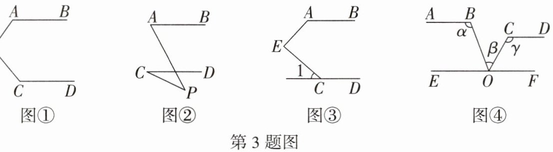 3. 衔接初中 (2024 河北衡水 APSY 中学分班考)下列结论:①如图①,AB//CD,则∠A+∠E+∠C= 180°;②如图②,AB//CD,则∠P= ∠A-∠C;③如图③,AB//CD,则∠E= ∠A+∠1;④如图④,直线 AB//CD//EF,点 O 在直线 EF 上,则∠α-∠β+∠γ= 180°。正确的个数有( )。