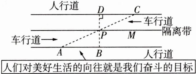 6 [2024常德期末]沛沛沿一段笔直的人行道行走,边走边欣赏风景,在由点C走到点D的过程中,通过隔离带的空隙P,刚好浏览完对面人行道宣传墙上的一条标语,具体信息如下:如图,AB//PM//CD,相邻两平行线间的距离相等,AC,BD相交于点P,PD⊥CD,垂足为D. 已知CD= 16米,则标语AB的长度为______米.
