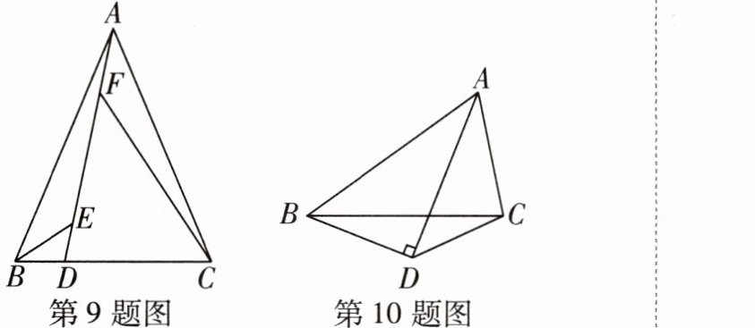 9 如图,在△ABC中,AB= AC,AB>BC,点D在边BC上,且$\frac{BD}{BC}= \frac{1}{4},$点E,F在线段AD上,满足∠BED= ∠CFD= ∠BAC. 若S_{△ABC}= 20,则S_{△ABE}+S_{△CDF}= ______