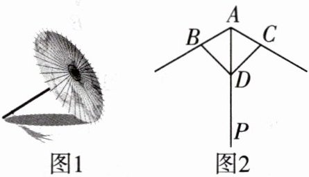 5 新趋势·传统文化[2024扬州仪征期中]如图1,油纸伞是中国传统工艺品之一,是一种纸制或布制伞. 油纸伞的制作工艺十分巧妙,如图2,伞圈D沿着伞柄AP滑动时,总有伞骨BD= CD,AB= AC,从而使得伞柄AP始终平分同一平面内两条伞骨所成的∠BAC. 请你说明其中的理由.
