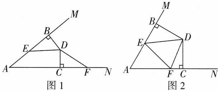 (1)因为DB⊥AM,DC⊥AN,所以∠DBE=∠DCF=90°.在△BDE和△CDF中,$\left\{\begin{array}{l} ∠BED=∠CFD,\\ ∠DBE=∠DCF,\\ BD=CD,\end{array}\right.$所以△BDE≌△CDF(AAS),所以DE=DF.