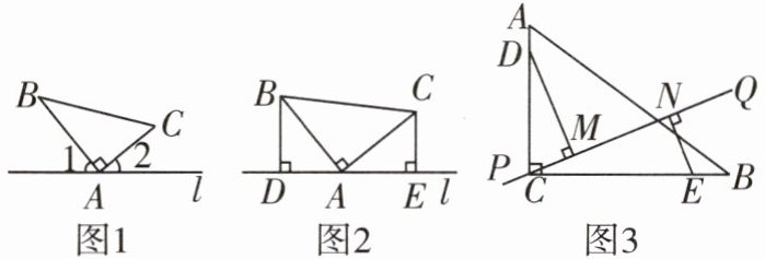 (3)解决问题:如图3,直线PQ经过$Rt△ABC$的直角顶点C,$△ABC$的边上有两个动点D,E,点D以2 cm/s的速度从点A出发,沿$AC→CB$移动到点B,点E以3 cm/s的速度从点B出发,沿$BC→CA$移动到点A,两动点中有一个点到达终点后另一个点继续移动到终点.过点D,E分别作$DM⊥PQ,EN⊥PQ$,垂足分别为M,N.若$AC= 12cm,BC= 16cm$,设运动时间为t s,当以点D,M,C为顶点的三角形与以点E,N,C为顶点的三角形全等时,求此时t的值.(直接写出结果)