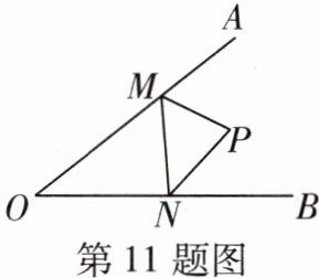 11 [2024无锡侨谊实验学校月考]如图,在∠AOB的边OA,OB上取点M,N,连接MN,MP平分∠AMN,NP平分∠MNB.若MN= 2,△PMN的面积是2,△OMN的面积是8,则OM+ON的长是______.