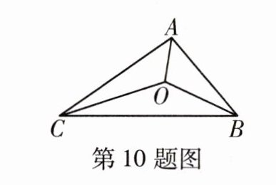 10 如图,△ABC的三边AB,AC,BC的长分别为4,6,8,∠BAC,∠ABC,∠ACB的平分线将△ABC分成三个三角形,则$S_{△OAB}:S_{△OAC}:S_{△OBC}$= ______.