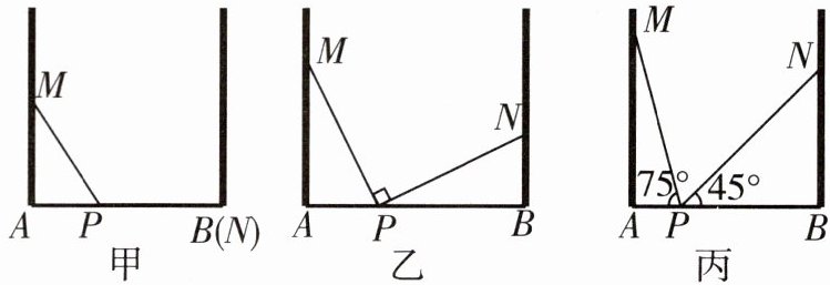 12 [应用意识][2025无锡新吴区期中]盼盼家新装修了房子,如图是其中的三个房间甲、乙、丙,她将一个梯子斜靠在墙上,梯子顶端距离地面的垂直距离记作MA,如果梯子的底端P不动,顶端靠在对面墙上,此时梯子的顶端距离地面的垂直距离记作NB.