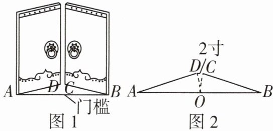 10 [新趋势·数学文化][2025连云港海州区期中]《九章算术》是古代东方数学代表作,书中记载:今有开门去阃(读kǔn,门槛的意思)一尺,不合二寸,问门广几何?题目大意:如图1和图2(图2为图1的平面示意图),推开双门,双门间隙CD的距离为2寸,点C和点D与门槛AB的距离都为1尺(1尺= 10寸),则AB的长是______寸.