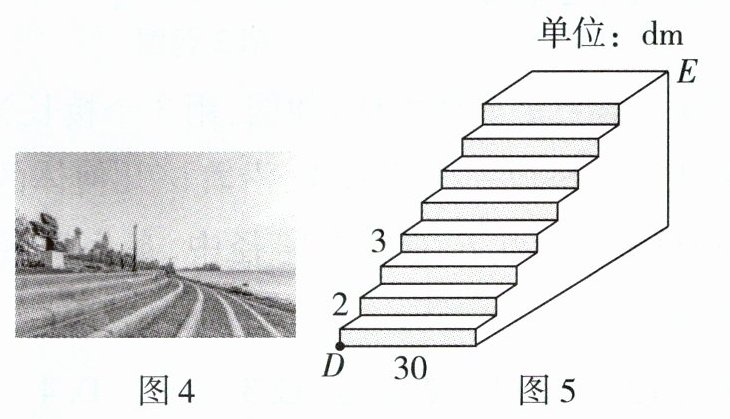 (5)图4是海港C附近的江滩台阶,共有8级, 每一级的长、宽、高分别为30 dm,3 dm, 2 dm,图5是其示意图.已知D和E是该台 阶上两个相对的点,若点D处有一只乌龟, 当台风来临时,为快速爬到点E处的绿植中 躲避台风,求该乌龟沿台阶面爬到点E的最 短路程.
