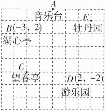 (1)中的平面直角坐标系,可知音乐台A的位置可表示为(0,4),望春亭C的位置可表示为(-2,-1),牡丹园E的位置可表示为(3,3).