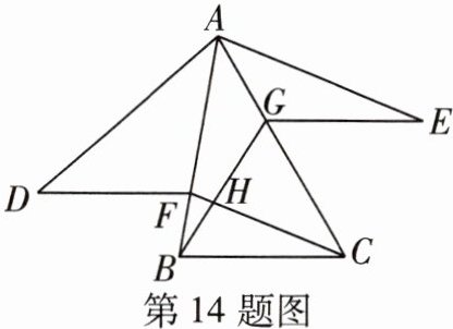 14 [2024扬州江都区八校联考]如图,在锐角三角形$ABC$中,$F$,$G分别是AB$,$AC$上的点,$\triangle ACF \cong \triangle ADF$, $\triangle ABG \cong \triangle AEG$,且$DF // BC // GE$,$BG$,$CF交于点H$.若$\angle BAC = 40^{\circ}$,则$\angle BHC$的度数为______.