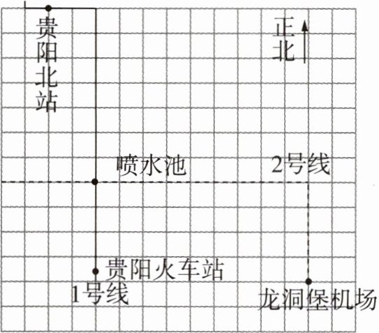 4 [2023 贵州中考] 如图是贵阳市城市轨道交通运营部分示意图,以喷水池为原点,分别以正东、正北方向为 $ x $ 轴、 $ y $ 轴的正方向建立平面直角坐标系,若贵阳北站的坐标是 $ (-2,7) $,则龙洞堡机场的坐标是____。