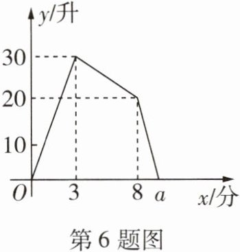 6 [2024 苏州中学一模]一个装有进水管和出水管的容器,开始时,先打开进水管注水,3 分钟时,打开出水管排水,8 分钟时,关闭进水管,直至容器中的水全部排完.在整个过程中,容器中的水量 $ y $(升)与时间 $ x $(分)之间的函数关系如图所示,则图中 $ a $ 的值为______