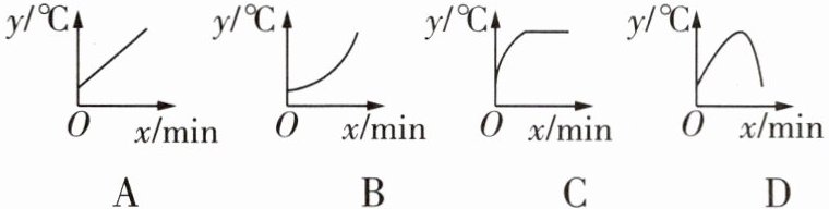 2 [2024 江西中考]将常温中的温度计插入一杯 $ 60^{\circ}C $ 的热水(恒温)中,温度计的读数 $ y(^{\circ}C) $ 与时间 $ x(min) $ 的关系用图象可近似表示为(