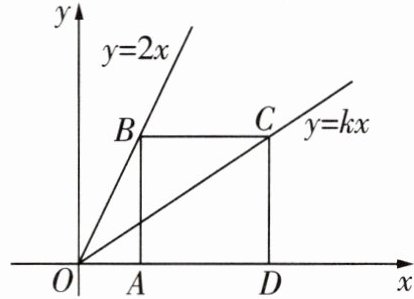 15 推理能力 如图,已知四边形$ABCD$是正方形,点$B,C分别在两条直线y= 2x和y= kx$上,$A,D是x$轴上的两点.