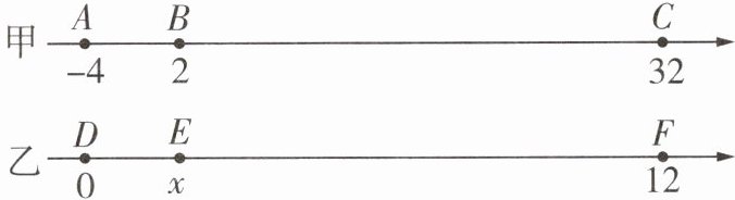 8 [新考法][2024 河北中考]如图,有甲、乙两条数轴. 甲数轴上的三点A,B,C所对应的数依次为-4,2,32,乙数轴上的三点D,E,F所对应的数依次为0,x,12。